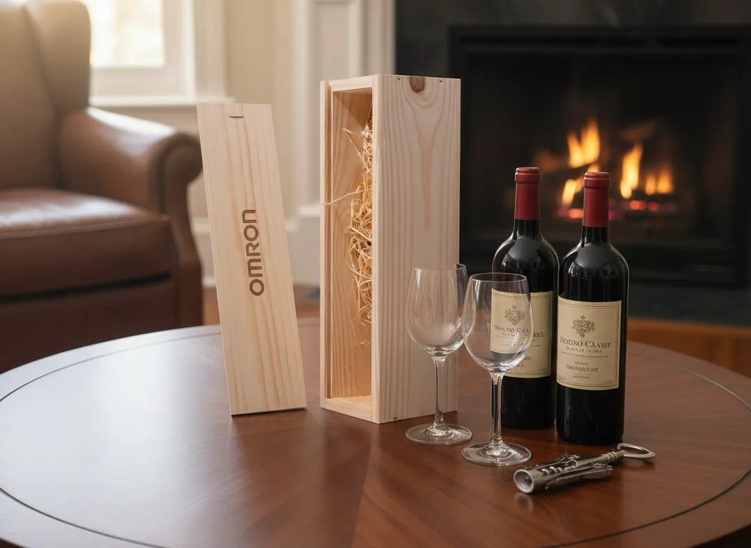 Elegante Weinkiste mit Firmenlogo. Inklusive Platz für 2 Flaschen.