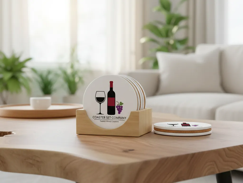 Set von 4 Untersetzern mit Firmenidentität. Perfekt als Schreibtischgeschenk.
